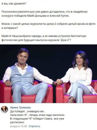 Как и предполагали подписчики, победа и возможность устроить роскошное бракосочетание достались Майе Донцовой и Алексею Купину. Более того, сами влюбленные, видимо, прекрасно знали о том, как повернутся события, задолго до оглашения результатов.