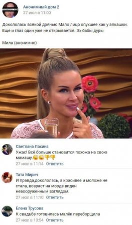 29 июля 2019 года лицо участницы телепроекта Марины Африкантовой, просто перекосившееся из-за переизбытка «уколов красоты», ужаснуло фанатов реалити-шоу. Всем известно о том, что молодая женщина усиленно скрывает от окружающих свой подлинный возраст. Почти все абсолютно уверены в том, что Марине давно минуло не только 30, но и 35 лет. Правда, сама Африкантова продолжает настаивать на том, что едва успела отметить 30-летие. Для того чтобы казаться более молодой и привлекательной, героиня телестройки регулярно пользуется помощью профессионалов в сфере косметологии. Но в последнее время все старания Марины в этом плане остаются совершенно безрезультатными. Фолловеры не сомневаются в том, что лицо Африкантовой в результате соответствующих процедур не только не помолодело, но и напоминает теперь маску. В то же время последние «обновления», которые Марина осуществила буквально перед самым бракосочетанием с Романом Капаклы, явно нанесли женщине серьезный вред. Телезрители потрясены перекошенным лицом Африкантовой. Более того, у нее лишь с огромным трудом может открыться левый глаз, жительница периметра выглядит полностью опухшей, словно в течение длительного времени она не переставала употреблять алкоголь.