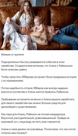 Однако в действительности почти никто не склонен верить в то, что отношения младшей сестры Ольги Рапунцель и Ромы завязались лишь в весьма недалеком прошлом. Любители телепрограммы без особых усилий раскрыли сговор Макеева и Савкиной, заключенный еще до начала их жизни в периметре. Судя по всему, Роман и Алена познакомились значительно ранее того момента, когда молодая мама опять вернулась на телестройку по завершении отпуска по уходу за младенцем. Более того, поклонники телешоу не сомневаются и в том, что эти двое, скорее всего, и в то время являлись не просто приятелями.