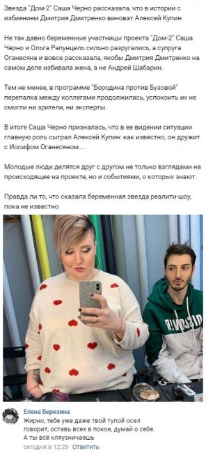 25 января 2020 оказалось, что в весьма неприятной истории, связанной с получением Дмитрием Дмитренко телесных повреждений, замешан еще один человек. Ни для кого уже не является тайной тот факт, что в периметре разразилась подлинная война между двумя будущими матерями, Ольгой Рапунцель и Александрой Черно, женщины не перестают высказываться по адресу друг друга крайне язвительно и чрезвычайно нелестно. Причиной конфликта служит и то обстоятельство, что жена Иосифа Оганесяна предъявила в отношении Рапунцель немаловажное обвинение. Уже на протяжении нескольких дней Саша усердно уверяет товарищей по реалити-шоу и подписчиков в том, что травмы мужу на самом деле нанесла именно Ольга. Правда, сам Дима продолжает настаивать, что в роли его обидчика выступил Андрей Шабарин. Но неожиданно Александра решила сдаться по поводу соответствующего вопроса. Как утверждает Черно, на ее взгляд на ситуацию оказал влияние коллега по телестройке Алексей Купин. Леше довелось присутствовать при ссоре Дмитрия и Андрея, к тому же молодой человек активно информировал о происходящем и Иосифа Оганесяна. Что касается Саши, то ее, по словам самой участницы телешоу, просто настроили определенным образом спутник жизни и его близкий товарищ.
