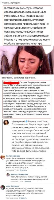 Молодая мама не скрывает от подписчиков, что пребывает в настоящее время в полнейшем отчаянии. В виртуальном пространстве женщина рассказала о беспощадном условии, которое поставили перед нею телеведущие, с чем Оля однозначно не в силах примириться. Невзирая на то, что Рапунцель все же не раскрыла перед фолловерами всех деталей составленного руководителями телешоу сценария, любителям программы уже ясно, что мужа Ольги Дмитрия Дмитренко усиленно подталкивают к неверности его «второй половинке».