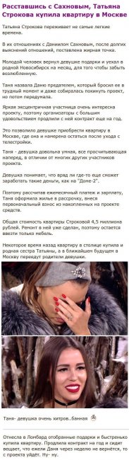 Однако если исходить из последних событий, то никак не следует ожидать ухода Татьяны с реалити-шоу, во всяком случае, в скором времени. В виртуальном пространстве имеются слухи относительно того, что немедленно после разрыва с Даниилом Таня поторопилась превратиться в столичную жительницу, купив себе квартиру на территории Москвы. Правда, Строкова, если верить соответствующим сплетням, приобрела жилье в рассрочку, и первый взнос женщине удалось внести благодаря тем финансовым средствам, которые Татьяна скопила за период пребывания на телепроекте.