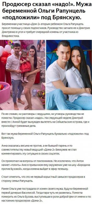 21 января 2020 года фанаты телевизионного шоу стали свидетелями того, как супруга ожидающей младенца участницы телепрограммы Ольги Рапунцель Дмитрия Дмитренко буквально подтолкнули к тому, чтобы мужчина изменил своей жене с другой обитательницей периметра Анной Брянской. Уже в течение нескольких недель Рапунцель не перестает жаловаться фолловерам на то, что ее семья оказалась жертвой поистине чудовищной несправедливости. По словам Ольги, руководство телепередачи просто «загнало в угол» чету Дмитренко и угрожает отобрать у них жилье, которое мама маленькой Василисы выиграла благодаря победе в состязании «Человек года». При этом Оле и Диме все же предоставляется шанс сохранить данную квартиру, однако только в случае выполнения весьма неприятных для них условий. Оказалось, что Дмитрию предложили совершить измену «второй половинке» с иной представительницей прекрасного пола. Выяснилось, что такой поворот событий необходим организаторам телепроекта ради увеличения рейтингов передачи. К тому же руководители программы уже успели даже выбрать девушку, с которой Дмитренко должен совершить требуемое действие, однако Рапунцель наотрез отказывается допустить, чтобы ее муж поступил подобным образом. Оля не только устроила грандиозный скандал организаторам телестройки, но и выдала фолловерам подробности сценария, разработанного на телепроекте. Как утверждает молодая мама, уже в ходе следующей недели Диме предстоит отправиться на Остров любви в компании с Анной Брянской, где между ними и случится запланированная руководством шоу связь. Стоит также обратить внимание на то обстоятельство, что ни сама Брянская, ни ее экс-возлюбленный Антон Беккужев пока не дали никаких комментариев по поводу соответствующих слов Рапунцель.