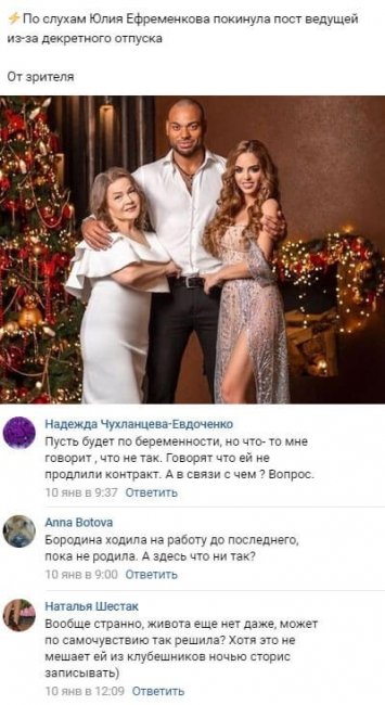 12 января 2020 года фанаты телевизионной программы узнали о том, по какой причине Юлия Ефременкова на самом деле перестала появляться в эфирах реалити-шоу. Многих чрезвычайно удивило внезапное исчезновение Юлии с телеэкранов. На просторах Интернета даже зародились слухи о том, что Ефременкова была уволена с занимаемого ею поста. Однако несколькими днями ранее молодая женщина твердо опровергла подобные сведения, подчеркнув, что обязательно вновь приступит к исполнению своих обязанностей по завершении отпуска. Правда, Юля не уточнила, сколько времени станет продолжаться ее отдых от проектных эфиров. Если исходить из свежих сплетен, Ефременкова может отсутствовать на телепередаче в течение полугода, поскольку прекращение ее выступлений перед телезрителями обусловлено ожиданием ребенка. Стоит вспомнить о том, что речь о возможной беременности Юлии уже шла и прежде. К тому же и сама женщина в ходе одного из проектных эфиров случайно проговорилась о пребывании в соответствующем положении. Подписчики уже сделали вывод о том, что Ефременкова была вынуждена столь рано оставить работу по причине регулярных перелетов, что чрезвычайно вредно для будущей матери.