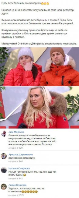 29 января 2020 года фолловерам стало известно о том, что руководство телевизионного проекта решилось сделать значительные уступки семейной паре Ольги Рапунцель и Дмитрия Дмитренко. На протяжении всех последних недель Оля и Дима были вынуждены усиленно защищаться от безжалостных нападок, которым подвергали чету Дмитренко их коллеги по телестройке. Сначала жертвой агрессии стал Дмитрий, получивший удар в лицо от Андрея Шабарина, а затем и у Ольги разразился достаточно серьезный конфликт с другой будущей мамой Александрой Черно. Всем уже отлично известно о том, что после пари, условия которого Рапунцель так и не сумела выполнить, Саша настойчиво требовала, чтобы Оля выплатила ей оговоренную сумму в 75 тысяч рублей. Вполне возможно, что Черно действительно добилась бы удовлетворения своего желания, если бы в происходящее не вмешались организаторы телешоу. В процессе очередного лобного места все четко расставила по своим местам шеф-редактор ток-шоу «Бородина против Бузовой» Татьяна Светлова. Татьяна без особых усилий разрешила данную ситуацию, в отличие от Антона Беккужева, который так и не смог призвать участников телепрограммы к порядку. Светлова сообщила о том, что семье Ольги и Дмитрия предоставляются столь льготные условия, каких никогда ранее на телестройке не наблюдалось. В течение всей последующей недели Рапунцель и Дмитренко разрешается посвящать все время отдыху, не исполняя никаких обязанностей, тогда как их товарищам по периметру телепроекта строго запрещается беспокоить супругов.