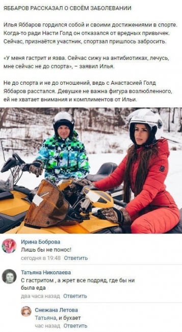 Однако в течение всего последнего времени Илье не приходится даже думать о физических упражнениях. Как утверждает сам Яббаров, причина создавшейся ситуации заключается в том, что его самочувствие неожиданно стало значительно хуже. При этом медики установили, что Илья страдает гастритом и язвой, ему назначены определенные антибиотики и соответствующая диета.