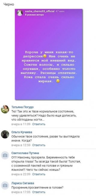 Саша сообщила подписчикам о том, что сейчас ее охватила подлинная депрессия. Как только молодая женщина немного успокоилась после противостояния с хейтерами и ссоры с Ольгой Рапунцель, как в ее жизни возникли новые сложности, причем на этот раз Черно чрезвычайно беспокоит ее внешний вид.