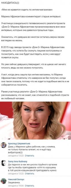 Однако даже подобное пристрастие является не самым главным минусом Африкантовой. Оказалось, что хейтеры вовсе не забыли и о школе, где Марина давала юным представительницам прекрасного пола специальные уроки по поводу того, каким образом следует доставить партнеру максимальное удовольствие в минуты физического контакта.