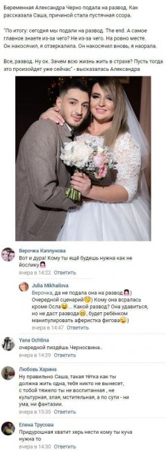 2 февраля 2020 года поклонники пары Иосифа Оганесяна и Александры Черно буквально не смогли поверить в последние новости, касающиеся названного семейства. Саша, готовящаяся в настоящее время к рождению наследника, просто потрясла подписчиков крайне неприятным для многих из них известием. Молодая женщина не стала скрывать того обстоятельства, что она уже разводится с мужем, к тому же будущая мама намекнула фолловерам, что именно стало причиной для принятия супругами такого решения. Как утверждает Черно, последняя ссора между нею и Иосифом случилась без всякого особенного повода. Александра вознамерилась поставить на место Оганесяна, который, с ее точки зрения, вел себя с нею совершенно неправильно. Но участник реалити-шоу не смог спокойно вытерпеть, когда Саша заговорила с ним «на повышенных тонах», разгневанный Иосиф жестко потребовал у жены расторжения брака. В то же время и Черно, судя по всему, не стала возражать, услышав желание Оганесяна. Оказалось, что супруги уже успели подать официальное заявление относительно развода. При этом Александра настаивает на том, что обратного пути для них уже не имеется. Женщина, по ее собственным словам, абсолютно не собирается провести всю жизнь, опасаясь того, что избранник в любой момент способен оставить ее в одиночестве.