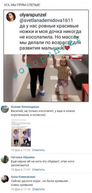 Сама Ольга категорически не желает признавать наличие у дочки данного дефекта. Молодая мама абсолютно не подтвердила сплетен, связанных с физическим развитием ее ребенка. По словам Рапунцель, Василиса обладает совершенно прямыми и здоровыми ногами, других трудностей у девочки также не имеется.