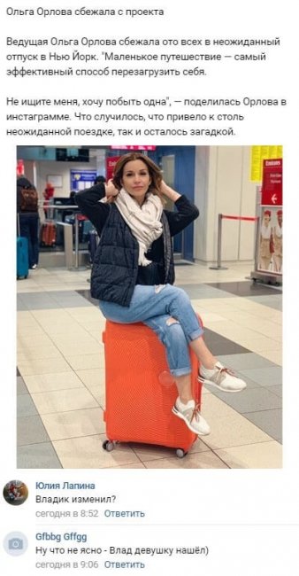 Обиженная Оля нашла возможность как следует досадить Владу и показать ему в полной мере, насколько непорядочно он поступил по отношению к ней. Никого не предупредив, Орлова покинула телепередачу, пожелав устроить для себя недолгий отпуск. В течение нескольких дней или даже недель Ольга собирается находиться в Соединенных Штатах. По словам женщины, в этот период она не планирует общаться даже с самыми близкими людьми и чрезвычайно нуждается в спокойствии и одиночестве.