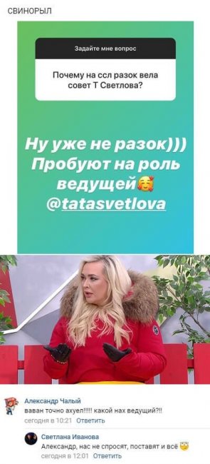 Правда, любители проекта изначально считали выступления Светловой в эфирах временными. Но участница телешоу Александра Черно уже дала все пояснения по соответствующему вопросу. В общении с фолловерами Саша прозрачно намекнула на то, что вскоре Таня получит и официальное назначение на тот пост, в котором так заинтересован Саленко.