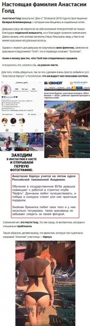 Но Анастасия Голд в течение достаточно длительного периода времени лгала товарищам по шоу и телезрителям. Девушка старалась заверить всех в том, что действительно носит фамилию Голд, однако внимательные подписчики уже разоблачили обман Насти. Фолловеры без лишних усилий смогли установить, что на самом деле фамилия этой участницы передачи Карпун, что, безусловно, не кажется столь же романтичным и впечатляющим, как Голд.
