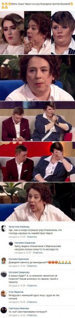 Сашу безжалостно раскритиковали присутствующие в ходе ток-шоу Бородина против Бузовой. К тому же женщина была вынуждена находиться лицом к лицу с родной матерью. Что касается мамы Александры, то она даже не предприняла попытки как-либо извиниться перед дочерью за не слишком радужное детство. Более того, саму Черно едва не заставили покаяться перед родительницей и попросить у нее прощения.