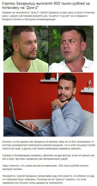 На протяжении следующих двух месяцев ни Валерий, ни Захар не смогут получать денежные средства за рекламу. К тому же материальные ресурсы, лишенными которых окажутся эти двое, попадут именно в карман пострадавшего Сергея. Судя по всему, организаторы телешоу решили таким образом достигнуть одновременно двух целей. В результате не только Захарьяш получит достаточно солидную компенсацию за нанесенные ему травмы, но и нельзя исключать возможности того, что после подобного наказания для любителей потасовок в периметре более не произойдет аналогичных случаев.