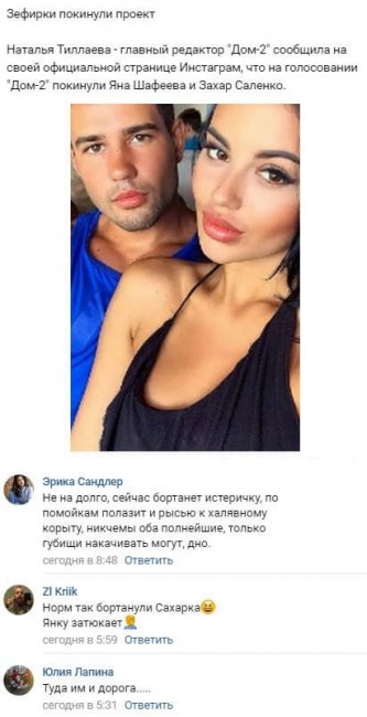 6 марта 2020 года на просторах Интернета появились свежие сплетни, которые явно не обрадуют преданных поклонников Захара Саленко и Яны Шафеевой. В течение последнего времени эти двое регулярно поднимают вопрос относительно ухода с телевизионной программы. Яна и Захар не отрицают, что их отношения никак нельзя считать безупречными, однако, как подчеркивают Шафеева и Саленко, ведущие реалити-шоу вовсе не торопятся помочь им улучшить ситуацию. К примеру, Захар не раз упоминал о том, что другие люди откровенно провоцируют его самого и его возлюбленную. Фолловеры не могут не понимать, что подобное положение вещей стопроцентно не устраивает героев телепередачи. В частности, непродолжительное время назад Яна и ее бойфренд оказались под серьезной угрозой расставания с проектом, и, скорее всего, именно это уже и случилось в реальности. Оказалось, что Саленко и Шафеева были номинированы на уход в субботу. Правда, пока неизвестно, оставили ли они периметр по итогам голосования либо по собственной воле решили распрощаться с телестройкой окончательно. Но по всему виртуальному пространству уже распространена информация о том, что Захар и Яна более не обладают статусом участников телепрограммы.