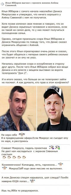 9 марта 2020 года на просторах Интернета возникли слухи относительно крупномасштабной ссоры, вспыхнувшей между Денисом Мокроусовым и Ильей Яббаровым, что в дальнейшем привело к изгнанию массажиста с телевизионного проекта. Илья изначально нисколько не отрицал неверия в долговечность и серьезность отношений своей экс-возлюбленной Алены Савкиной и Мокроусова. В процессе общения с ведущими телестройки и жителями периметра Яббаров регулярно подчеркивал, что мама маленького Богдана всегда сразу же объявляет о пылких чувствах к очередному избраннику, однако ее общение с молодыми людьми никогда не завершалось какими-либо реальными результатами. Такой же взгляд на ситуацию Илья выражал и в случае Дениса. К тому же Яббарову совершенно не понравилось, что массажист, срок знакомства которого с Савкиной составляет лишь около месяца, уже разрешает себе ставить условия отцу маленького Богдана. В частности, некоторое время назад Мокроусов сообщил, что намеревается постоянно наблюдать за общением Алены и Ильи, что заставило Яббарова фактически потерять самообладание. Яростное выяснение отношений между представителями сильного пола переросло в грандиозный конфликт. Более того, в итоге всего случившегося Денис оказался за границами периметра телестройки. Если верить свежим сплетням, то Илья просто выбросил возлюбленного Савкиной за пределы телепрограммы, указав на то, что Мокроусов не посмеет когда-либо опять появиться на телешоу.