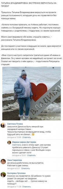 Ни для кого уже не секрет, что запланированный отдых Татьяны Владимировны завершился несколькими неделями ранее намеченного срока. Когда матери Алены Савкиной и Ольги Рапунцель стало известно о происходящем в периметре, женщине пришлось немедленно отправиться на телестройку в связи с полнейшим провалом ее младшей наследницы.