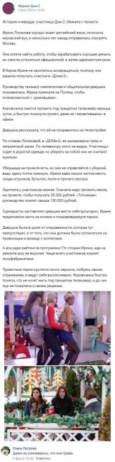 15 марта 2020 года девушка, прибывшая на телевизионную программу из Кирова и поторопившаяся покинуть телепроект, поделилась информацией о том, что в действительности происходит в периметре телестройки. Всем отлично известно о том, что многие молодые люди стремятся обрести статус участников реалити-шоу. Однако в реальности существование под контролем камер оказывается под силу отнюдь не всем. Невзирая на то, что издали жизнь персонажей телепередачи может показаться лишенной всяких забот и полной позитивных эмоций, герои проекта вынуждены адаптироваться к тому, что процесс проведения съемок является абсолютно ненормированным, причем данный минус является вовсе не единственным для обитателей периметра. Ирина Логинова, уроженка Кирова, которой даже не довелось предстать перед зрителями в эфире телестройки, провела на программе менее одних суток, затем напуганная девушка буквально убежала с шоу. Как утверждает Ира, которая все же решилась дать журналистам интервью «без прикрас», она надолго запомнит этот непродолжительный период времени, причем однозначно не с самой положительной стороны. Логинова не в силах скрыть настоящего шока в связи с поистине антисанитарными условиями, в которых приходится проживать участникам передачи. Невзирая на наличие на телестройки уборщицы, она не в силах поддерживать элементарный порядок, поскольку герои телестройки вовсе не отличаются хотя бы минимальной аккуратностью. В памяти Ирины осталась пыль, лежащая повсеместно толстыми слоями, огромное количество мусора и разлагающиеся остатки еды. Девушку также и сейчас преследует крайне неприятный запах и отвратительное качество пищи, предлагаемой персонажам телешоу. К тому же Ире совсем не понравились и юноши, обитающие в периметре. По ее словам, по манере вести себя эти парни скорее напоминают представительниц противоположного пола. Те, кто живет в мужской спальне, заняты исключительно сплетнями и тем, что любуются собой перед зеркалом, что вовсе не свойственно подлинным мужчинам.