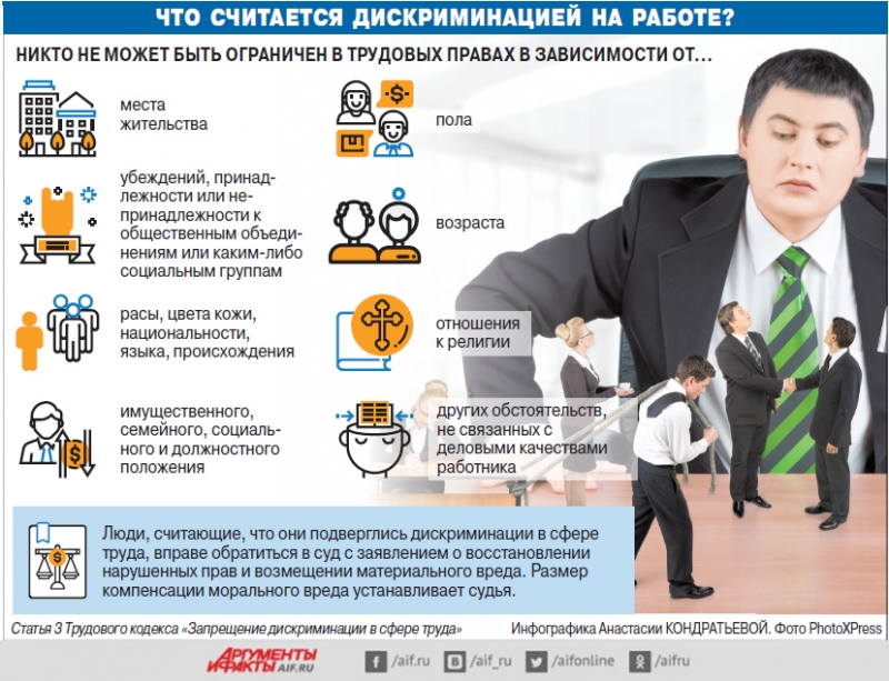 «Статья 3 Трудового кодекса о дискриминации (см. инфографику) нарушается в нашей стране очень часто. Недавно ко мне на консультацию приходил мужчина, который хотел устроиться бухгалтером, но его не взяли - нужна была именно женщина. Другой случай - человека не взяли на работу из-за неславянской внешности и даже в отказе не постеснялись написать об этом, - говорит зампредседателя совета НП «Юристы за трудовые права» Сергей Саурин. - Часто абсурдные требования работодатели начинают предъявлять, когда работники не соглашаются на предложенные им ухудшения условий труда. К примеру, водителям одной из известных продуктовых сетей решили сократить зарплату. Мужики отказались подписывать соглашения, и начальство изменило их режим работы: раньше у них была смена с 7 утра до 7 вечера, а теперь они должны были крутить баранку с 3 ночи до 3 дня. Люди не могли приехать к этому времени на работу, опаздывали, из-за этого их увольняли. Но потом по суду они снова восстанавливались».