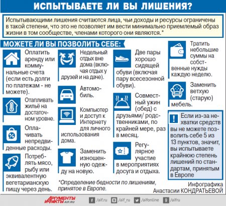 Например, 68% семей с детьми в нашей стране не могут позволить себе оплатить непредвиденные расходы. Половина не в силах поменять старую мебель на новую. Более 1/3 имеют в течение года задолженность по оплате ЖКУ, и около 20% не могут хотя бы через день съесть мясо, птицу или рыбу.