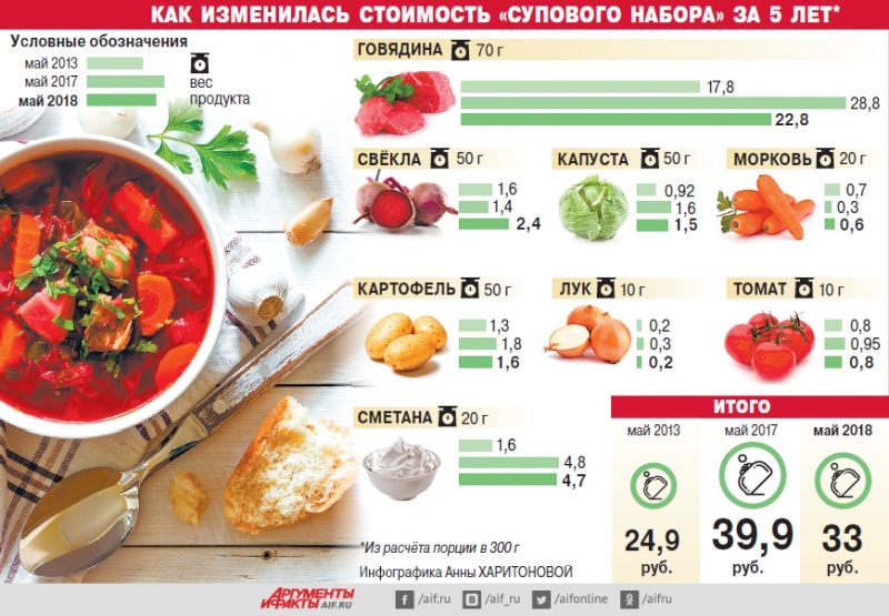 Однако общей картины это не улучшает: за год, по данным портала «Ценомер», овощи в общей массе прибавили в цене на 37,3%. Так, за 1 кг разных овощей (к примеру, на суп) в апреле (на этот месяц пришёлся максимальный рост цен) можно было отдать 141 руб., а в 2017 г. эта сумма не превышала 100 руб.