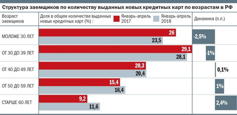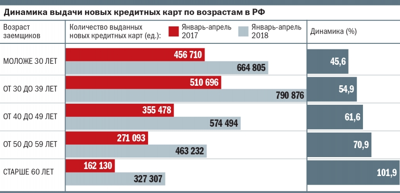 Так, в январе—апреле 2018 года по сравнению с аналогичным периодом 2017-го гражданам в возрасте от 50 до 59 лет было выдано на 71% больше карт, а тем, кто старше 60 лет,— на 102%. В результате доля представителей этих двух возрастных групп в общем объеме кредиток перевалила за четверть.