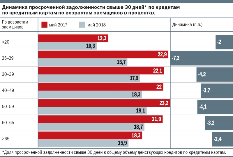 Более того, статистика НБКИ говорит о снижении просрочки по кредитным картам. Так, по данным бюро, с мая 2017-го по май 2018 года у клиентов в возрасте от 50 до 59 лет она уменьшилась на 4,1 процентного пункта, от 60 до 65 лет — на 3,2 п. п., а у тех, кто старше 65,— на 2,4 п. п. Вообще, за год просрочка именно по кредитным картам снизилась у всех возрастных категорий.