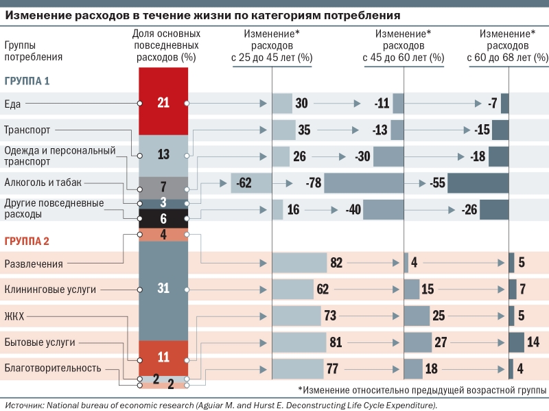 Дело в том, что экономисты давно установили: повседневные расходы человека на протяжении жизни образуют своеобразный горб: где-то до 50 лет они растут, а после начинают снижаться. Однако, как установили Агияр и Хёрст, это всего лишь «средняя температура по больнице». Отдельные расходы и не думают снижаться или снижаются гораздо меньшими, чем остальные, темпами.
