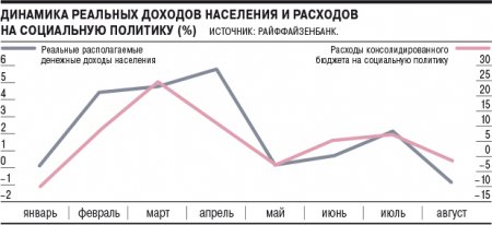 В августе 2018 года Минэкономики и независимые аналитики зафиксировали торможение годовой динамики ВВП. Причины — резкий спад выпуска в АПК и продолжающееся сжатие внутреннего спроса. Его последствия особенно заметны в промышленности, где в сентябре и текущий оптимизм, и прогнозы снизились до минимумов последних двух с половиной лет. На фоне падения реальных доходов и снижения соцвыплат бюджетникам вероятный новый виток девальвации рубля и рост цен от повышения НДС охладят до конца года и потребление граждан.По оценке Минэкономики, опубликованной в сентябрьском докладе «Картина деловой активности», в августе годовой рост ВВП замедлился до 1% с 1,8% в июле, снизив накопленную динамику до 1,6% в январе—августе 2018 года. Со стороны производства добавленной стоимости причиной такого замедления стал спад выпуска в сельском хозяйстве на 10,8% в годовом выражении в августе (см. “Ъ” от 18 сентября). Схожая картина наблюдалась и в динамике показателя GDP Tracker (оценивает состояние экономики по месячному выпуску базовых отраслей) аналитиков Capital Economics, отметивших, что спад в сельском хозяйстве окажет негативное влияние на динамику ВВП в короткой перспективе. Просел и показатель, оценивающий динамику экономики со стороны спроса: сводный опережающий индикатор Центра развития Высшей школы экономики в годовом выражении впервые с середины 2016 года снизился в августе на 0,4% после обнуления в июле. Авторы исследования отмечают, что к заметному снижению новых заказов добавился небольшой рост запасов готовой продукции (лишнее подтверждение снижения спроса). «Даже заметный рост нефтяных цен (на 37% по сравнению с августом 2018 года) и ослабление рубля (обычно повышающее ценовую конкурентоспособность отечественных производителей) не смогли компенсировать негативных последствий сокращения внутреннего спроса»,— отмечают они. На снижение внутреннего спроса несколько месяцев указывают и опережающие показатели состояния производств. Заметим, что первые результаты конъюнктурных опросов промышленников ИЭП имени Егора Гайдара в сентябре фиксируют продолжение снижения объема продаж (чуть меньшее, чем в августе) — и рост выпуска, превышающий спрос (который компании склонны сильно переоценивать),— что привело к «формированию высокого избытка запасов готовой продукции». Работа на склад, в свою очередь, вызвала падение индексов промышленного оптимизма и прогнозов — до минимумов за два с половиной года. Зафиксированное Росстатом в августе первое в 2018 году снижение реальных доходов граждан на фоне торможения роста зарплат, вероятнее всего, продолжится. Так, аналитики Райффайзенбанка указывают на фактическое обнуление годовой динамики социальных расходов консолидированного бюджета, которые служили одним из основных источников поддержки потребительского спроса и настроений в предвыборной первой половине 2018 года (см. график). Отрицательная динамика потребления продовольствия в начале третьего квартала является этому косвенным подтверждением. Всплеск же спроса на непродовольственные товары и банковские кредиты на фоне девальвации рубля отражает поведение немногочисленной, но растущей группы обеспеченных граждан. По данным сентябрьского мониторинга социально-экономического положения и самочувствия населения РАНГХиГС, в августе 2018 года по ср