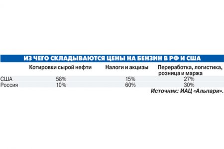 Российский бензин никогда не дешевеет, потому что ценообразование на отечественном рынке нефтепродуктов серьезно отличается от американских стандартов. По словам исполнительного директора Российского топливного союза Григория Сергиенко, фискальная часть «съедает» не менее 60% тарифов на бензин. «Котировки сырой нефти закладывают в цену топлива около 10%. Переработка, логистика и издержки в рознице составляют примерно 20% стоимости горючего. И лишь 10% приходится на маржу, которую зарабатывают продавцы топлива, — отмечает замглавы ИАЦ «Альпари» Анна Кокорева. — На стоимость топлива в России влияет в гораздо большей степени не цена нефти, а налоги, поэтому, когда котировки «черного золота» снижаются, потребитель не видит никаких изменений в рознице».