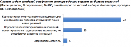 Проведенный нами замер отношения к нефтяной отрасли среди IT-специалистов (выборка — 700 респондентов) показал довольно оптимистичные цифры: 77% от общего числа опрошенных отмечают, что цифровое направление является приоритетом для нефтяной отрасли, 72% убеждено, что корпоративная культура нефтяных компаний открыта инновациям. Однако, глядя на «Роснефть», «Лукойл», «Газпром нефть», респонденты учитывают уже не масштаб компаний, а качество корпоративной среды, уровень внутреннего «софта»: персональных взаимодействий, репутации лидеров, атмосферы, которая должна допускать элементы венчурного подхода, право на риск, и значит — право на ошибку. Поэтому в опросе по привлекательности корпоративных брендов на рынке труда первое место оказывается за компанией, которая занимает только третье место по уровню добычи.