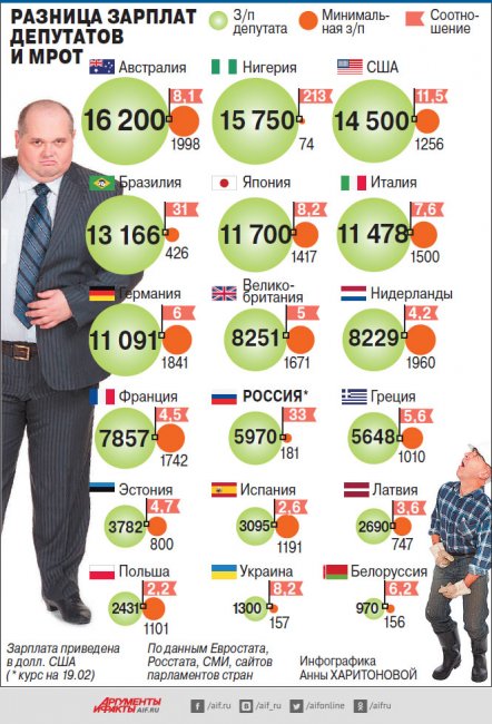Депутатов называют народными избранниками и слугами народа. Интересно, а сколько они зарабатывают? И как сильно отличается доход парламентариев от зарплат народа, который их выбрал?«АиФ» изучил статистику, официальные данные сайтов парламентов и сравнил зарплаты депутатов разных стран. Где больше получают? Что удивительно, в топ-5 самых высокооплачиваемых попали парламентарии не только таких развитых стран, как Австралия, США и Япония, но и Нигерии с Бразилией — там получают аж по 13–15 тыс. долл. в месяц. Самыми низкооплачиваемыми оказались депутаты в Белоруссии и на Украине. А народные избранники России по уровню доходов приблизились к парламентариям таких европейских государств, как Франция и Греция. Впрочем, цифра эта плавающая. По курсу рубля на 1 января 2020 г. (доллар тогда стоил 61,9 руб.) средний заработок наших депутатов в 400 тыс. руб. равнялся 6462 долл. А к 29 февраля курс изменился — уже 66,9 руб., и их зарплата в долларах сократилась до 5979. То есть потеряли почти 500 баксов. Но народ, который их выбрал, тоже получает зарплату в рублях, и в пересчёте на доллары она также уменьшилась. Поэтому куда интереснее другой показатель: соотношение заработков парламентариев к минимальной зарплате в стране, меньше которой людям платить не должны. Например, во Франции, Великобритании, Нидерландах и Германии разница между доходами слуг народа и самого народа — 4–6 раз. В Испании, Польше и Латвии того меньше — заработки избранников лишь в 2–3 раза больше минималки. На их фоне разрыв в доходах между доходами депутатов и МРОТ в Нигерии кажется просто фантастическим — местные парламентарии получают аж в 213 раз больше минималки! Большая разница в зарплатах также в Бразилии (в 31 раз) и в России — члены нашего парламента зарабатывают в 33 раза больше, чем установленный ими в 2020-м МРОТ в размере 12 130 руб. Зарплату парламентария — к средней по стране? «Хотите поменять (зарплату депутатам. — Ред.) — поменяйте, и все разойдутся. Это тяжелейшая работа. У нас уже была зарплата 30 тысяч, и что?» — высказался на прошлой неделе в телеинтервью депутат со стажем Владимир Жириновский. Дискуссии о том, чтобы привязать депутатскую зарплату к минималке или средней по стране, идут давно. Существует закон, по которому зарплата руководителей, их замов и главбухов государственных и муниципальных предприятий не может более чем в 8 раз превышать зарплату рядовых сотрудников. Почему бы не распространить данное правило на депутатов? Кстати, два года назад группа депутатов ГД вышла с инициативой приравнять их зарплату к средней по стране, причём даже без повышающих коэффициентов (по итогам 2019-го она составила 44 тыс. руб.). «Размер ежемесячной зарплаты депутатов ГД достиг уровня, который в несколько раз превышает уровень средней заработной платы по РФ, — говорилось в пояснительной записке к документу. — Кроме того, законопроект отменяет ряд необоснованных привилегий членов СФ и депутатов ГД по медицинскому, санаторно-курортному, бытовому и пенсионному обеспечению». Но судьба законопроекта оказалась печальна. Пролежав пару лет в парламенте, 12 декабря 2019 г. он был отклонён.