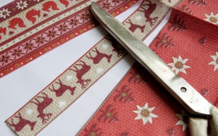 Подберите подходящие мотивы и вырежьте (или вырвите) их из салфетки. Подойдут не только длинные полоски-орнаменты, но и одиночные элементы – изображения снеговиков, гномов, елок и т.д.