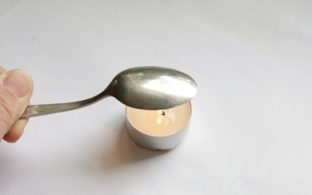 Зажгите «рабочую свечу». Нагрейте над ней чайную ложку так, как показано на снимке – копоть останется на внутренней стороне ложки, а внешняя – рабочая – сторона останется чистой.