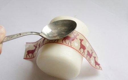 Пока ложка не остыла, круговыми движениями прикатайте выбранный мотив к поверхности свечи. Парафин, подплавляясь, пропитает салфетку, и она приклеится к свече.