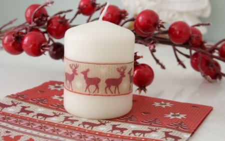 Эта очень простой способ сделать обычные безликие свечи праздничными и нарядными. Вам потребуются: • белые свечи любого размера и толщины; • салфетки с подходящим рисунком • чайная ложка; • греющая или любая другая «рабочая» свеча. Подберите подходящие мотивы и вырежьте (или вырвите) их из салфетки. Подойдут не только длинные полоски-орнаменты, но и одиночные элементы – изображения снеговиков, гномов, елок и т.д. Примерьте выбранный мотив, наложив его на боковую поверхность свечи. Снимите два нижних слоя салфетки, оставив только верхний цветной. Зажгите «рабочую свечу». Нагрейте над ней чайную ложку так, как показано на снимке – копоть останется на внутренней стороне ложки, а внешняя – рабочая – сторона останется чистой. Пока ложка не остыла, круговыми движениями прикатайте выбранный мотив к поверхности свечи. Парафин, подплавляясь, пропитает салфетку, и она приклеится к свече. Используйте для оформления только белые или кремовые свечи, на цветных наклеиваемая картинка просто пропадет, так как салфетка тонкая и прозрачная. Украшенные таким способом свечи — отличный подарок на Рождество. Совет: соберите «коллекцию» белых свечей разной формы и размера, но с одинаковым рисунком. Составьте из них композицию в центре праздничного стола.