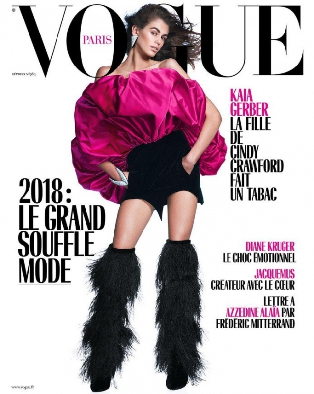 Журналисты напоминают, что Синди Кроуфорд появилась на обложке американского Vogue в 1986 году в возрасте 20 лет.На февральском глянце Кайя Гербер предстает в необычном платье от Saint Laurent с пышным ярко-розовым верхом и обтягивающим черным бархатным низом. Прекрасный образ дополняют высокие черные сапоги на каблуках, отделанные страусиными перьями, и блестящие крупные серьги и браслет.