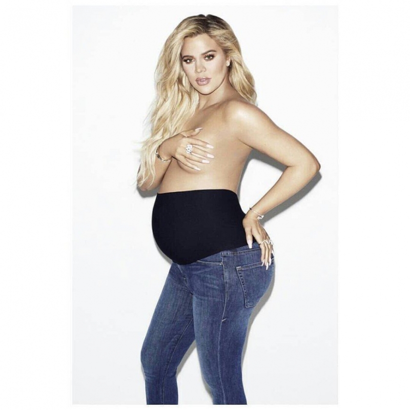 33-летняя Хлои Кардашьян выпустила собственную коллекцию одежды для беременных женщин под названием Good Mama Maternity. Будущая мама приняла участие в рекламной фотосессии, на которой позировала всего лишь в одних синих джинсах. Грудь Хлои целомудренно прикрыла одной рукой, а живот был скрыт специальной черной фиксирующей вставкой одежды.