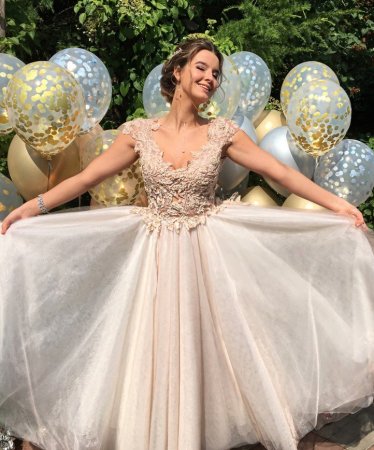 Минувшим вечером, переходящим в ночь, тысячи российских выпускников праздновали окончание школьной поры и вступление во взрослую жизнь. В числе счастливых молодых людей оказалась и 17-летняя Саша Стриженова. Приготовления к выпускному шли с самого утра, к девушке приезжал стилист, который сделал ей прическу и макияж. Для такого важного знакового события Саша Стриженова выбрала нежное платье молочно-кофейного оттенка с пышной юбкой. Пикантности наряду придали открытая спина и глубокое декольте, демонстрирующее красивую грудь юной Саши.