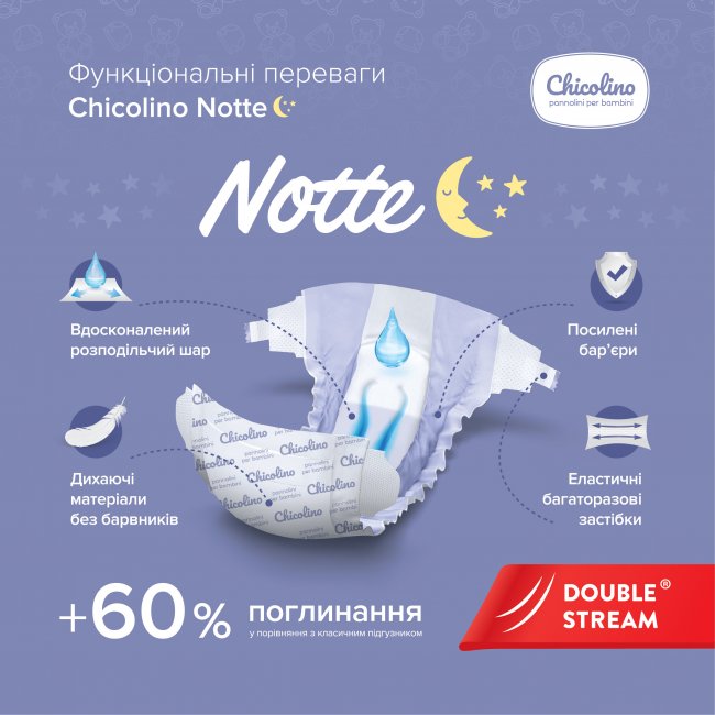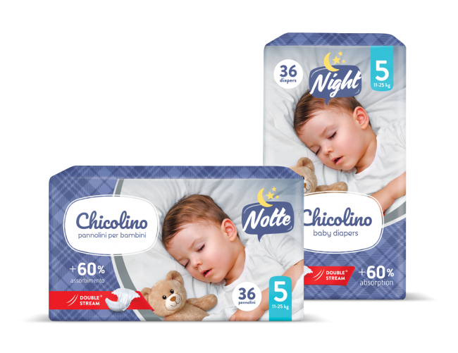 Chicolino не припиняє вдосконалювати свою продукцію, щоб забезпечити ще більшу якість та комфорт. До Дня захисту дітей, бренд презентує серію нових нічних підгузків з технологією Double Stream. Більше не треба переривати нічний сон заради заміни підгузка! Турбуючись про щасливе дитинство свого малюка, тепер мами можуть обирати якісну продукцію за справедливою ціною.