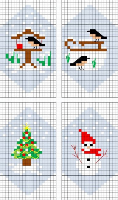 Такие маленькие схемы для новогодней вышивки крестиком подойдут тем, у кого уже есть хоть какой-то опыт в вышивании. Они не очень сложные и не очень большие, но это не делает их менее праздничными и красивыми.