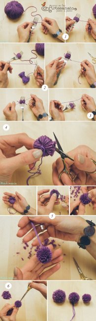 Суть всех мастер-классов с фото, как сделать помпон из ниток (пряжи) своими руками в принципе одна и та же. Меняются только приспособления. Это может быть вилка, кусок картона, вырезанный определенным способом или втулки от туалетной бумаги. В любом случае вам нужно будет намотать на приспособление множество слоев нити (чем пышнее должен быть помпон, тем больше). Затем крепко перевязать намотанную нить посередине, это будет центр помпона. И разрезать по краям место соединения намотанной нити. Но одних слов мало, лучше посмотрите внимательно фото, где детально и понятно показано, как сделать помпон из пряжи.