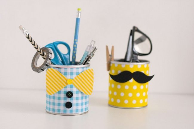А еще можно сделать интересные органайзеры для канцелярии из пустых банок из-под молочной смеси или кофе. Для украшения банки послужит упаковочная бумага или декоративный скотч и цветной картон или другие элементы декора для деталей.