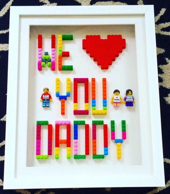 А еще надпись "Мы любим тебя, папа" можно выложить из деталей Лего, ведь если в доме есть дети, там обязательно найдется этот конструктор.