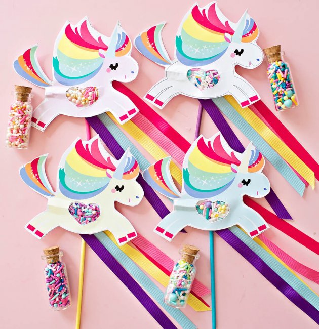 Вырежьте две зеркально отображающиеся половинки единорога, между ними вложите разноцветные ленточки, а посередине — палочку, склейте половинки единорога. Таким единорогом на палочке можно украсить праздничную выпечку, либо играться им на улице, наблюдая, как ленточки развеваются по ветру.