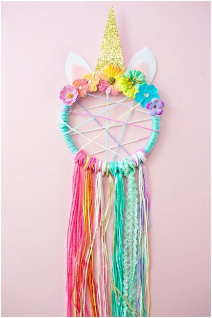 Ловец снов, который из оберега превратился в красивый декор комнаты, любительница единорогов тоже может сделать в соответствующем стиле. Такого ловца можно повесить на стену, на дверь комнаты или на окно. Его можно сделать из кружев и лент, нитей и бусин, украсить цветами и, конечно же, не забыть про рог и ушки.