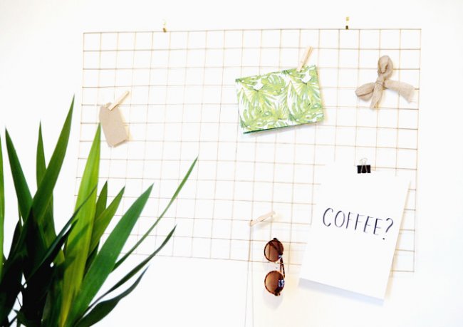 У этих штук много названий: бизи-борд, мемори-борд, доска для заметок. Но как бы они не назывались, стоит признать, что такая металлическая сетка — это отличный способ организовать заметки, фотографии и различные мелочи, которые постоянно захламляют письменный стол. Подробное описание, как сделать такой бизи-мемори-борд, читайте по ссылке Как сделать доску для заметок своими руками.