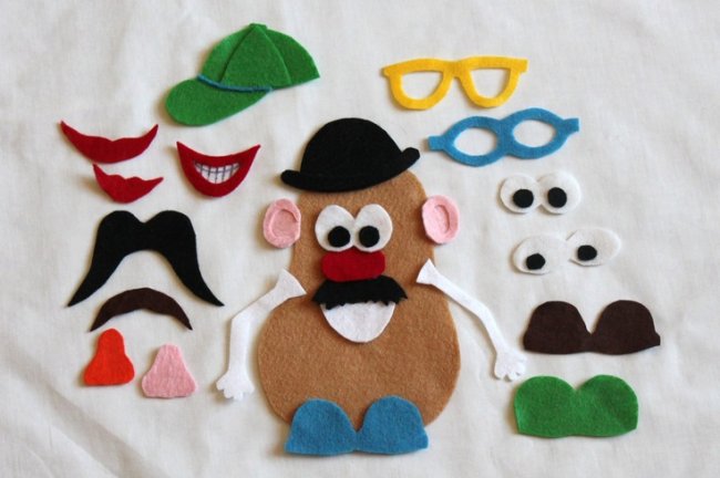 Например, мистера Картошку. вырежьте из фетра картошку, также вырежьте из фетра других цветов для него глазки, нос, шляпы, усы и прочие атрибуты. Его можно возить с собой в сумке или оставить дома, но в любом случае, мистер Картошка принесет уйму радости. Лучшей игры для малышей сложно придумать.