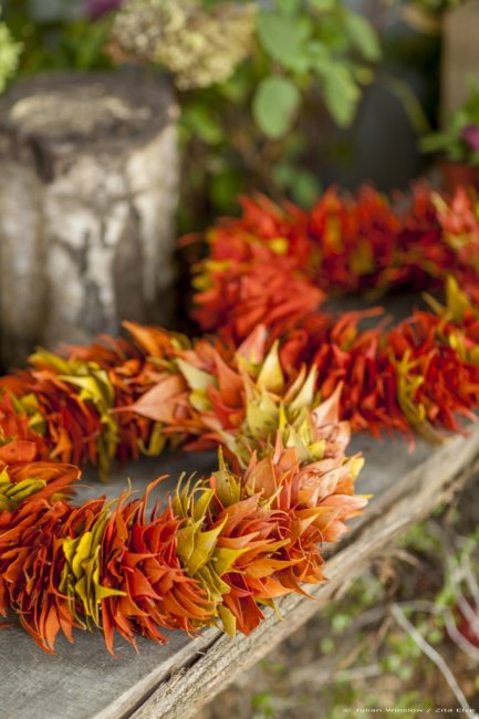 Для осінніх композицій підійде будь яке яскраве листя, ягоди, різнокольорові овочі, зелень, шишки, жолуді та інші природні матеріали, які знайдуться у вашому домі.